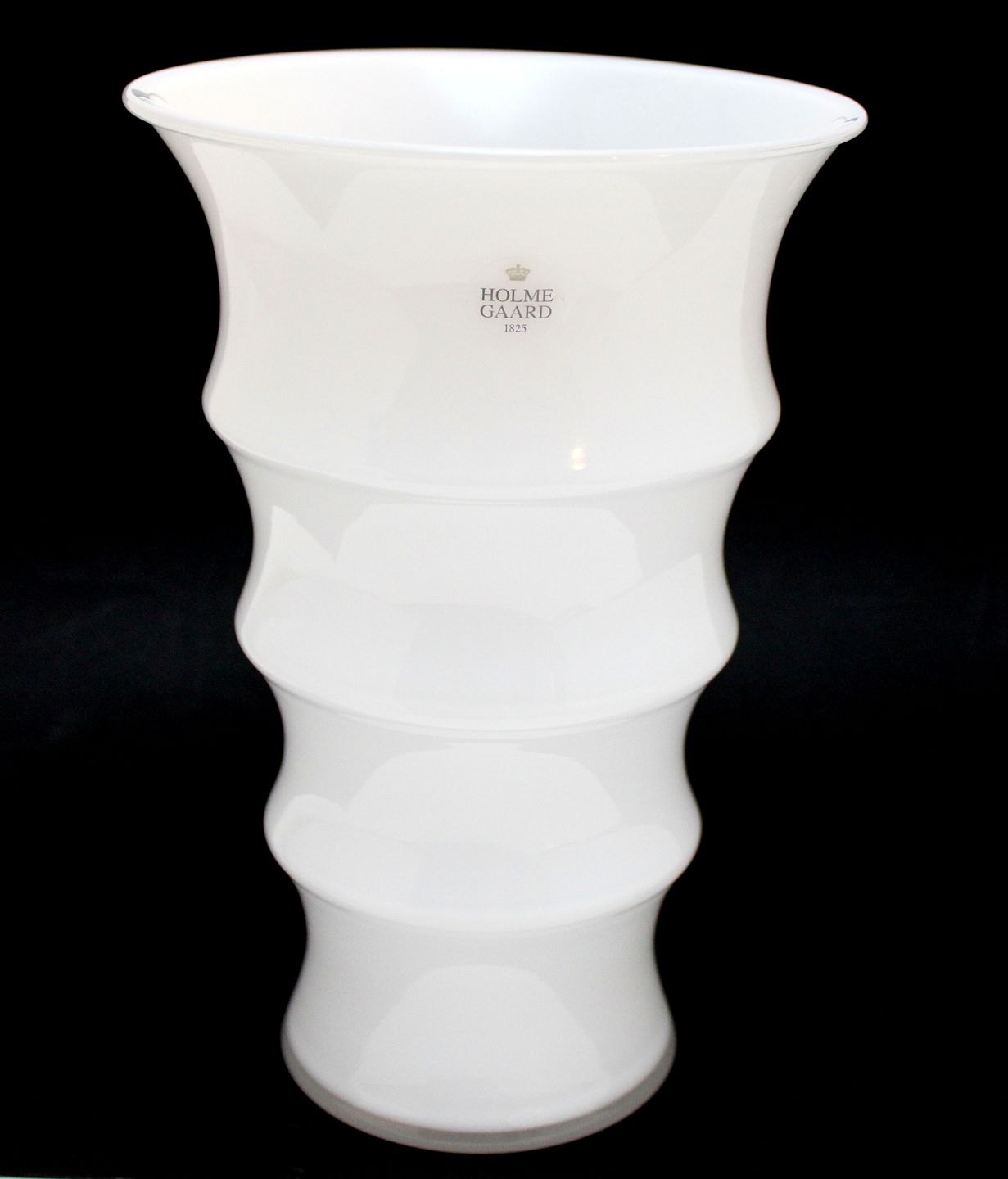 Holmegaard, Karen Blixen opalinehvid mellemstor vase. Designet af Anja Kjær i 2000. Vasens form er inspireret af afrikanske kvinders hals og armringe.