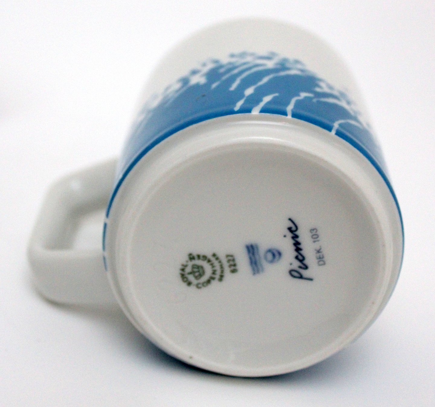 Royal Copenhagen, Picnic, Kaffekrus med blå dekoration. Designet af Grethe Meyer og Ole Kortzau. Nr. 6227. Dekoration 103. Højde 9,5 cm. Diameter 7,5 cm. Flot stand. I. sortering. Pris: 300 kr. stk. Lager: 2