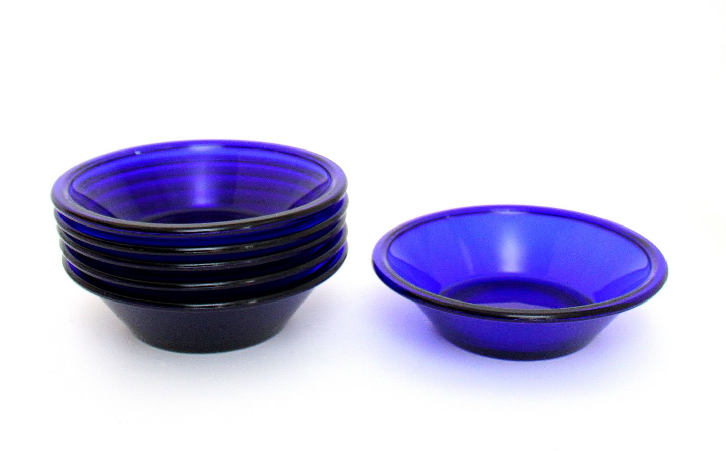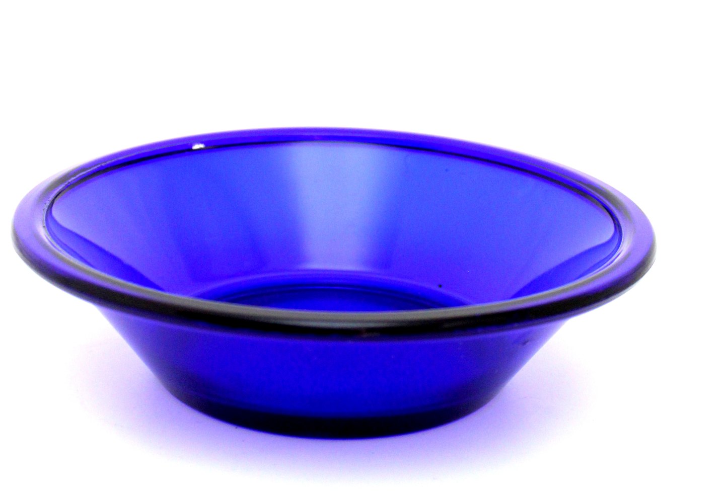 Holmegaard, Else, Tykmælksskål i presset kobolt blå glas. Designet i 1938 og produceret frem til slut 1970'erne i varierende størrelser, men samme form og blev kaldt ymerskål Højde 4 cm. Diameter 15,5 cm. Flot stand. Pris: 100 kr. stk. Lager: 8