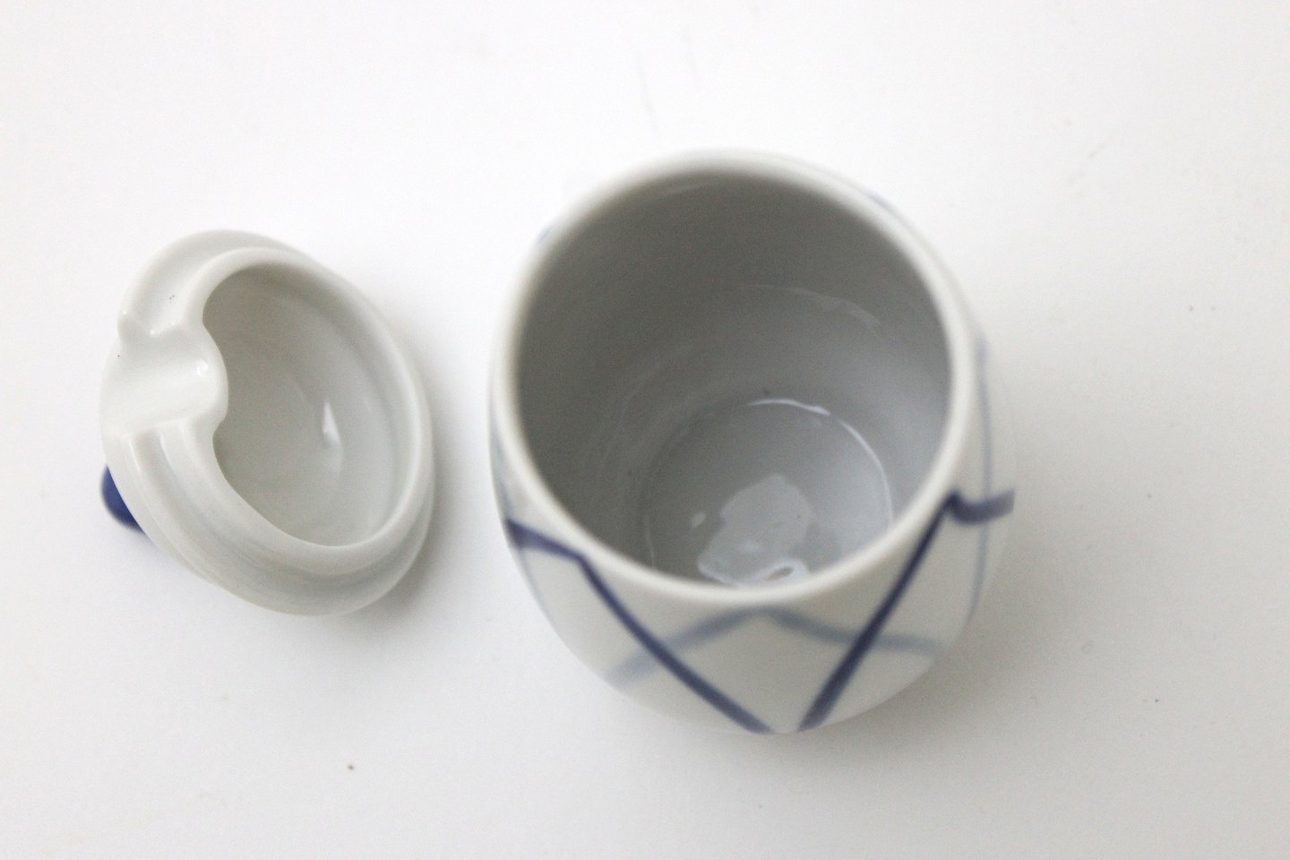 Dan-ild Lyngby, Harlekin/Blå flamme. Sennepskrukke med låg. Design Axel Brüel i 1958. Højde 9 cm. Diameter 4,5 cm. Pris: 150 kr. stk. Lager: 1