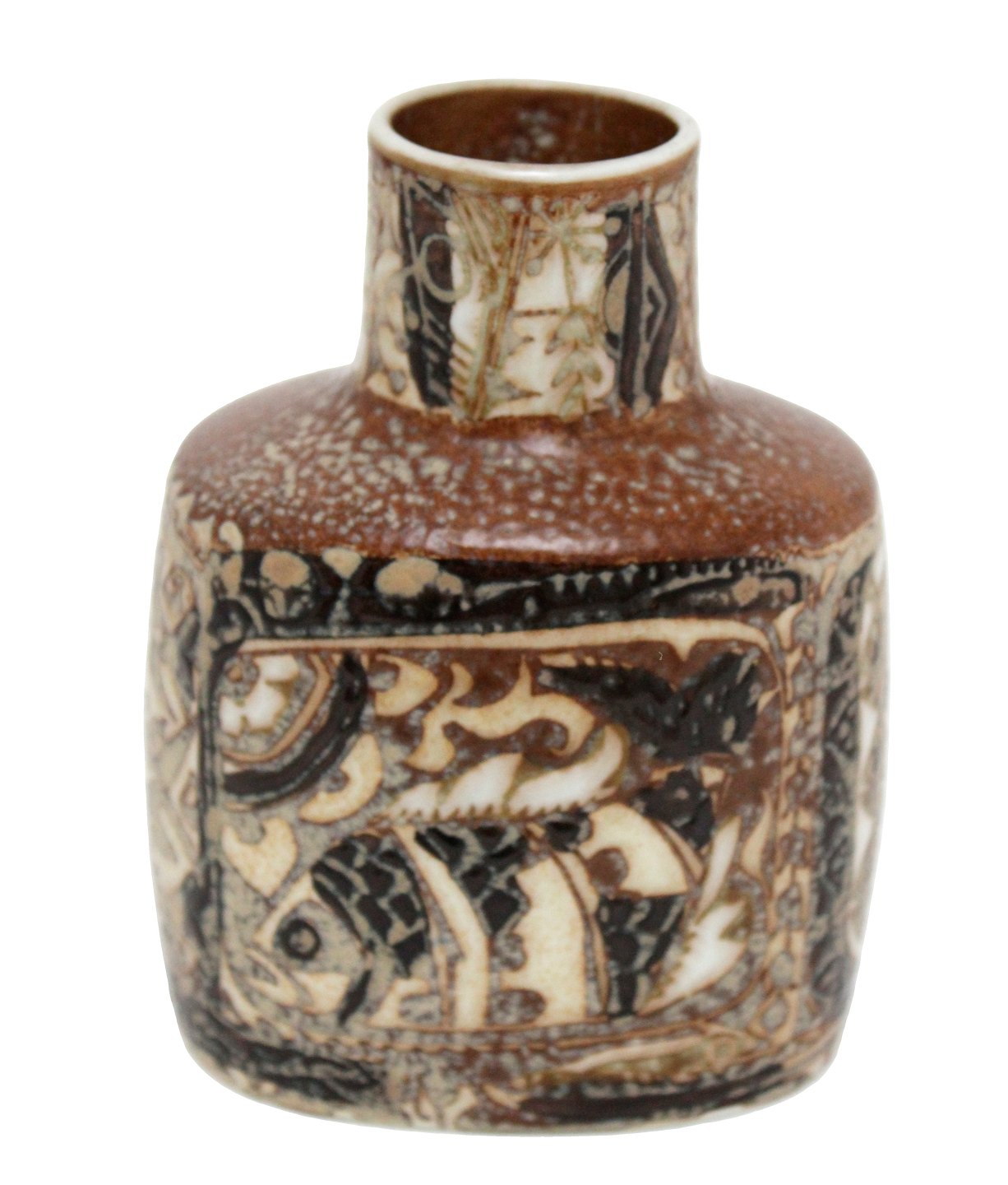 Royal Copenhagen, Baca Kunstfajance firkantet lille vase i brun og gylden glasur med Fiskemotiver på alle 4 sider. Designet af Nils Thorson. Nr. 719/3207. Højde 13 cm. Længde 10 cm. Bredde 6,5 cm. Top diameter 4,5 cm. II. sortering. Pris: 300 kr.