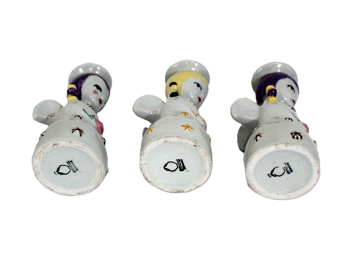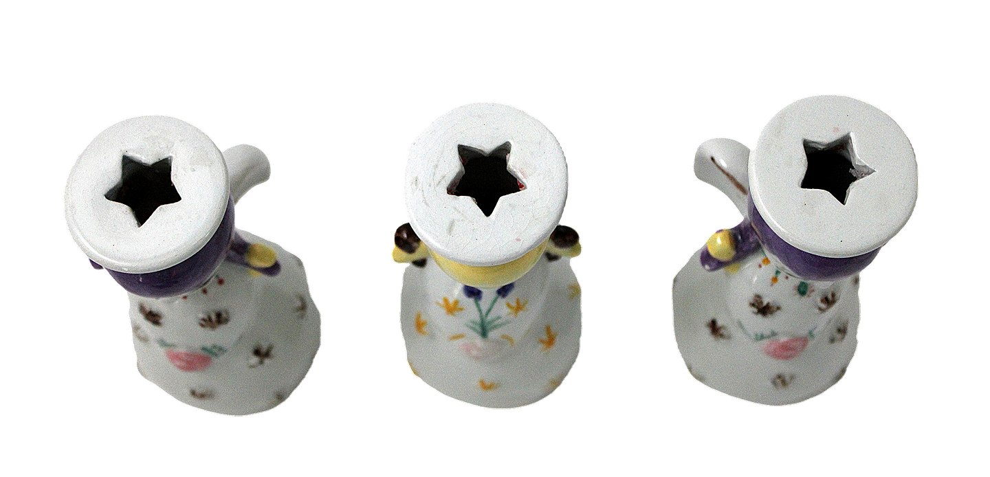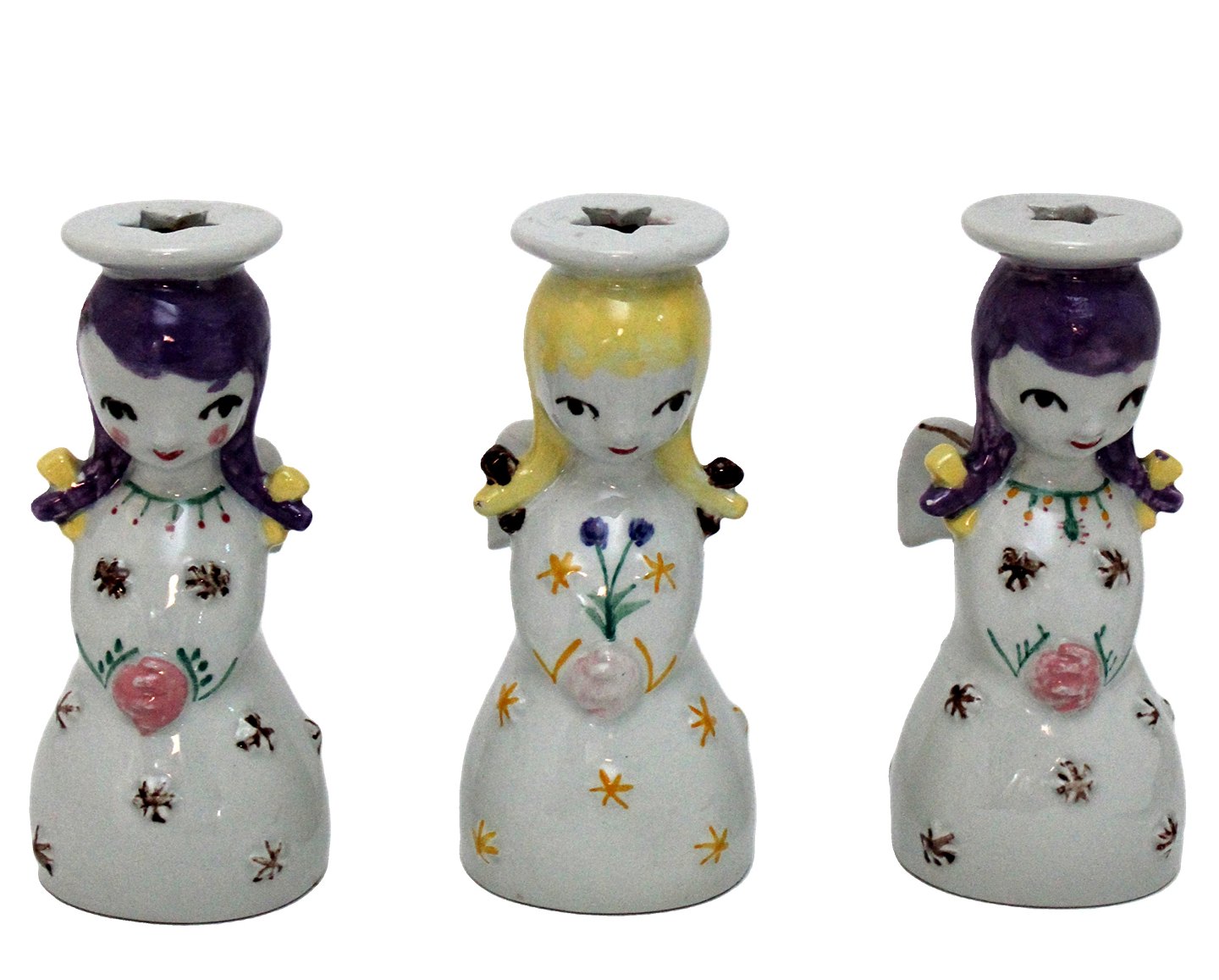 Nymølle/Knabstrup. Yderst sjældne lys engle. Formen er produceret på Knabstrup og englene er håndmalede på Nymølle. Højde 12 cm. Flot stand med få overfladekrakeleringer og minimal chip på fletninger. Den lilla farve er lidt mørkere på foto. Samler objekt. Sælges samlet. Pris: 3500 kr.