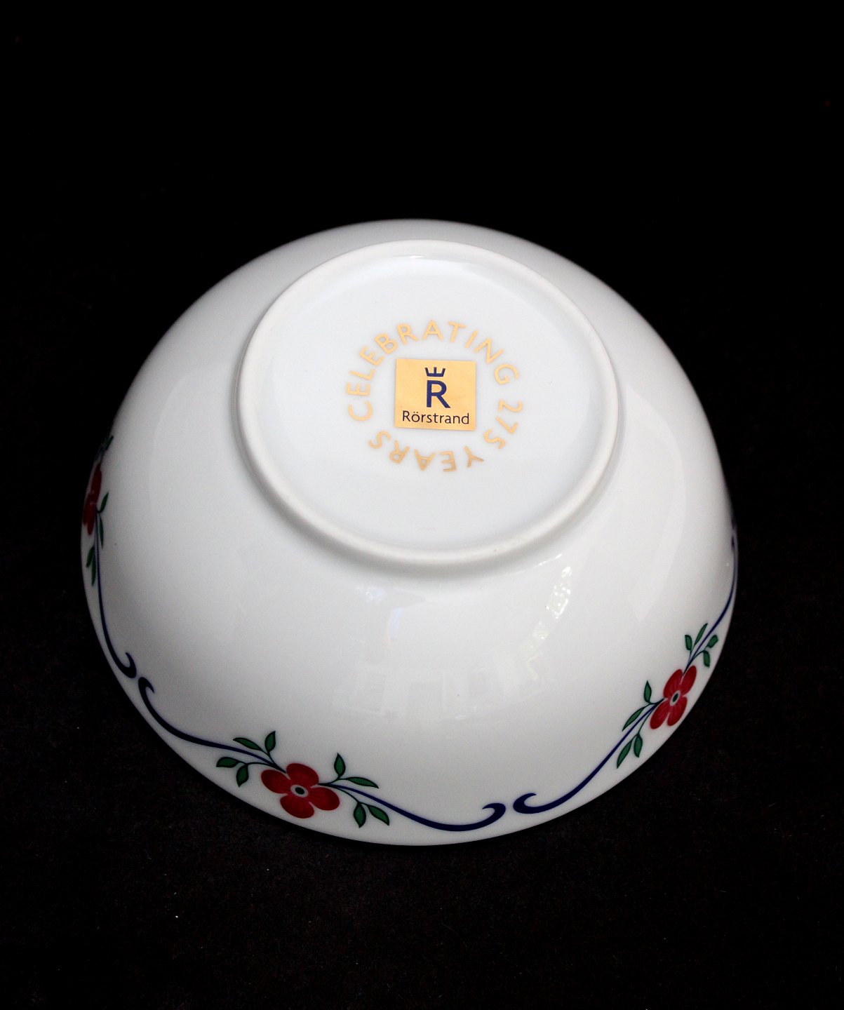 Rørstrand, Sundborn, dishwasher safe porcelæn. Dekoreret af Pia Rönndahl. Fra det oprindelige Rørstrand, da de stadig producerede i Sverige. Lille skål. 275 års Jubilæum. Højde 5 cm. Diameter 12 cm. Pris: 125 kr. stk. Lager: 1
