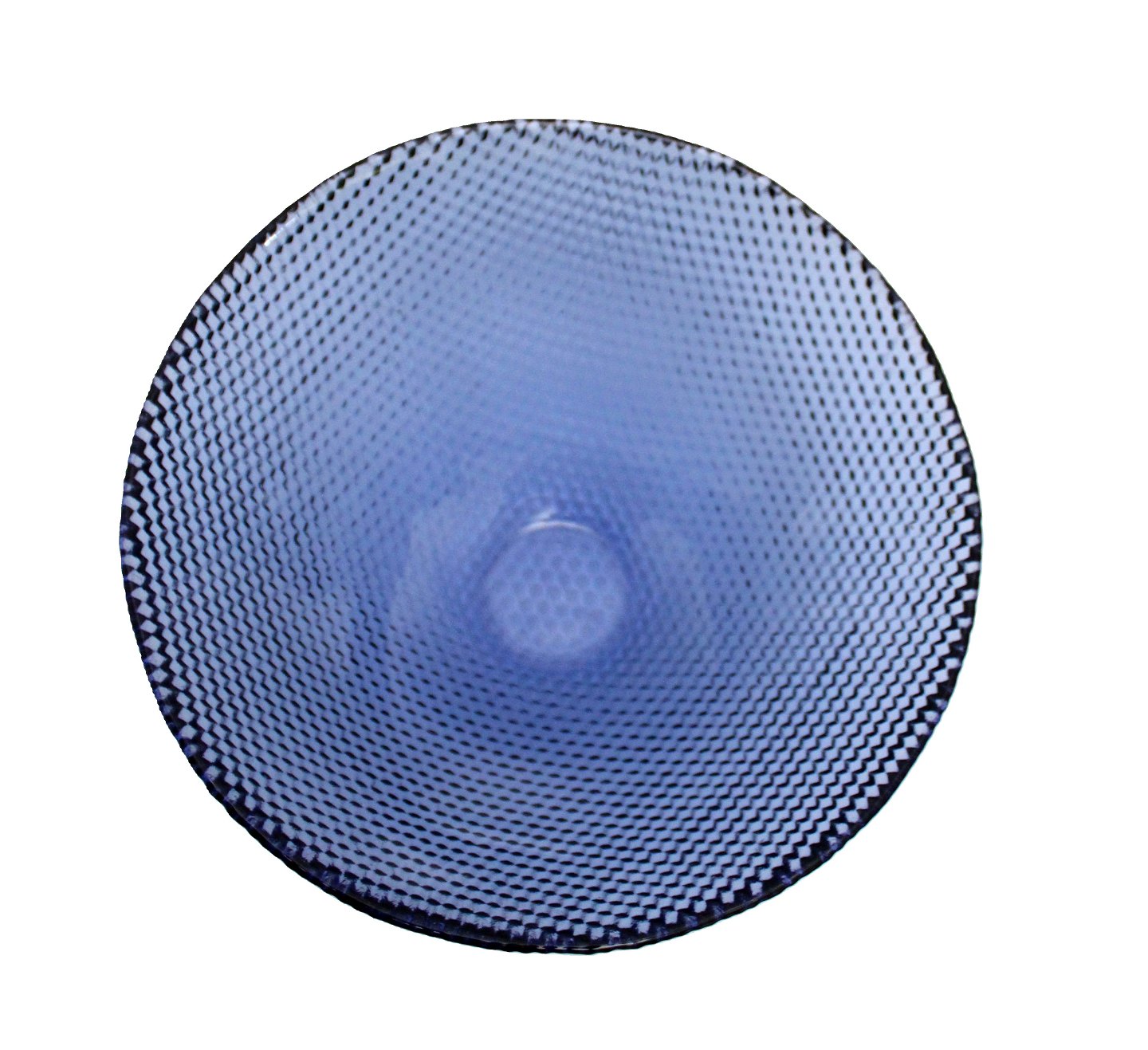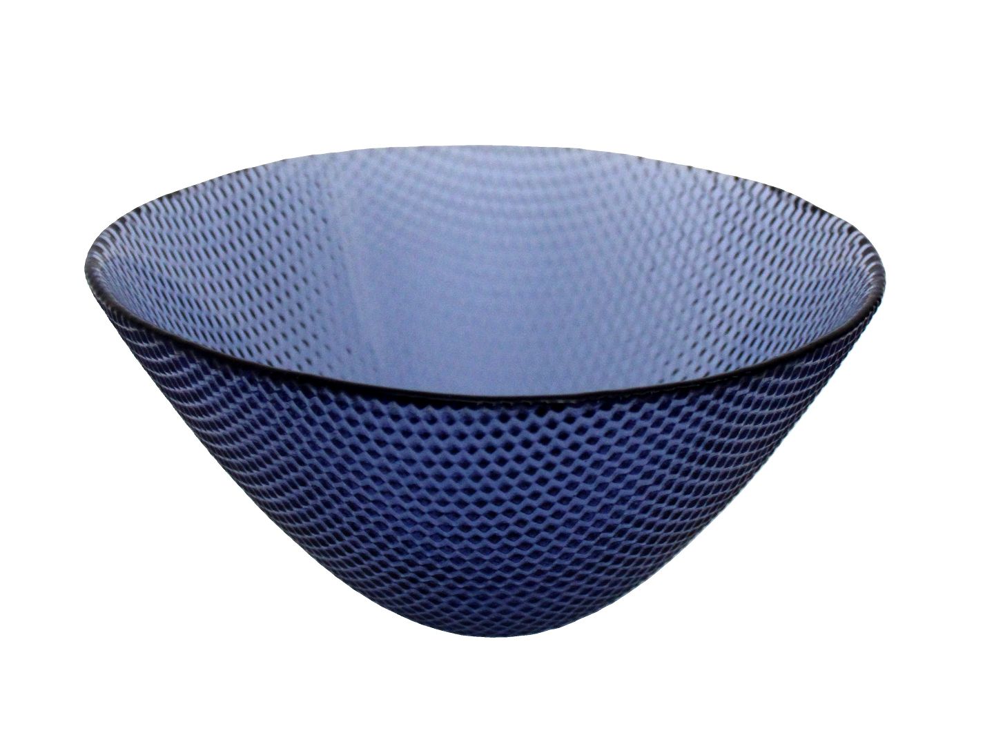 Holmegaard, Trigona skål i lilla/lavendelfarvet glas. Designet af Torben Jørgensen i 1988 for Royal Copenhagen. Centrifugeret serie, glat indre og kube mønstret yderside. Lavendelfarven er ikke ramt rigtigt på fotos, hvor den virker nærmest blå. Trigona serien er også produceret i klar, grøn og blåt glas. Diameter 25 cm. Højde 12,5 cm. Pris: 250 kr. stk. Lager: 1