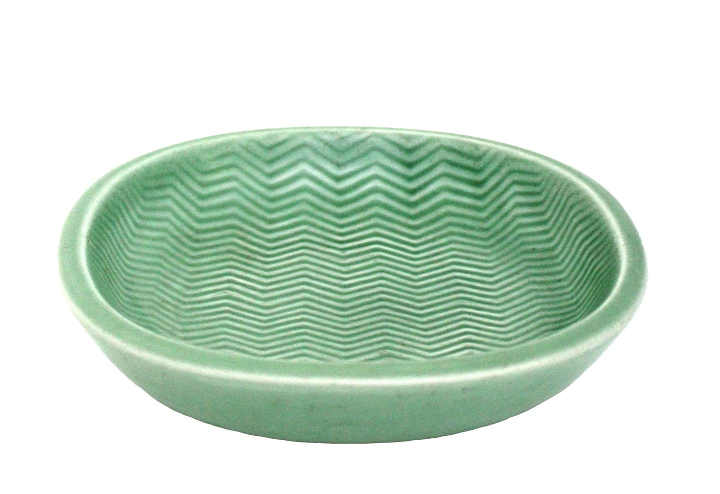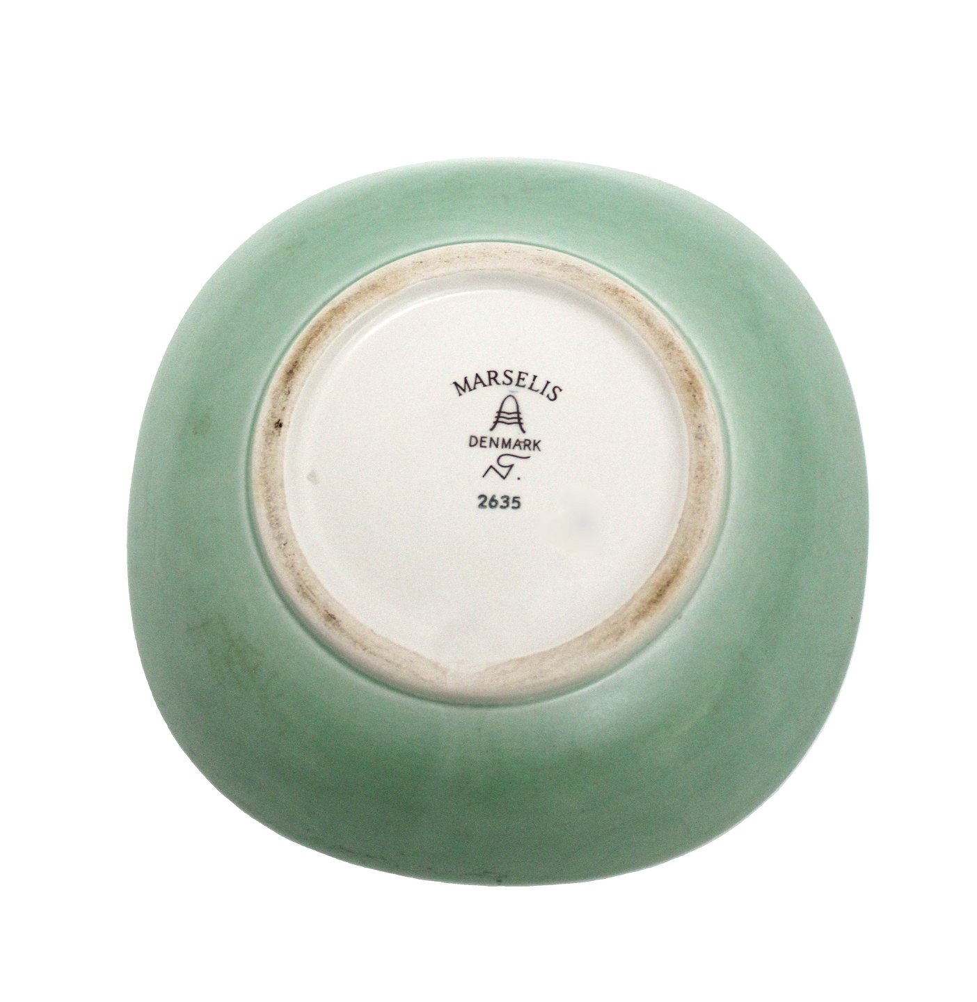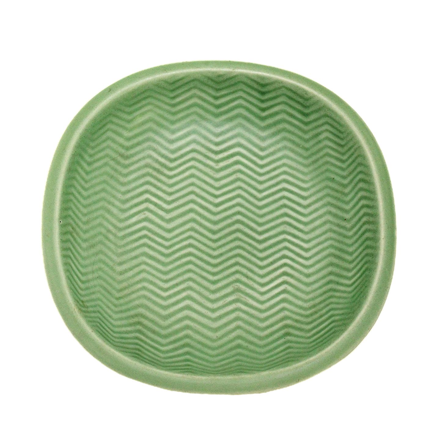 Aluminia, Marselis, kunststengods, Mintgrøn fad med siksakmønster. Designet af Nils Thorsson i perioden 1953-1960. Nr. 2635. Højde 4,5 cm. 18 x 18 cm. Rimelig stand med brugsspor og enkelte overfladekrakeleringer. Pris: 300 kr. stk. Lager: 1