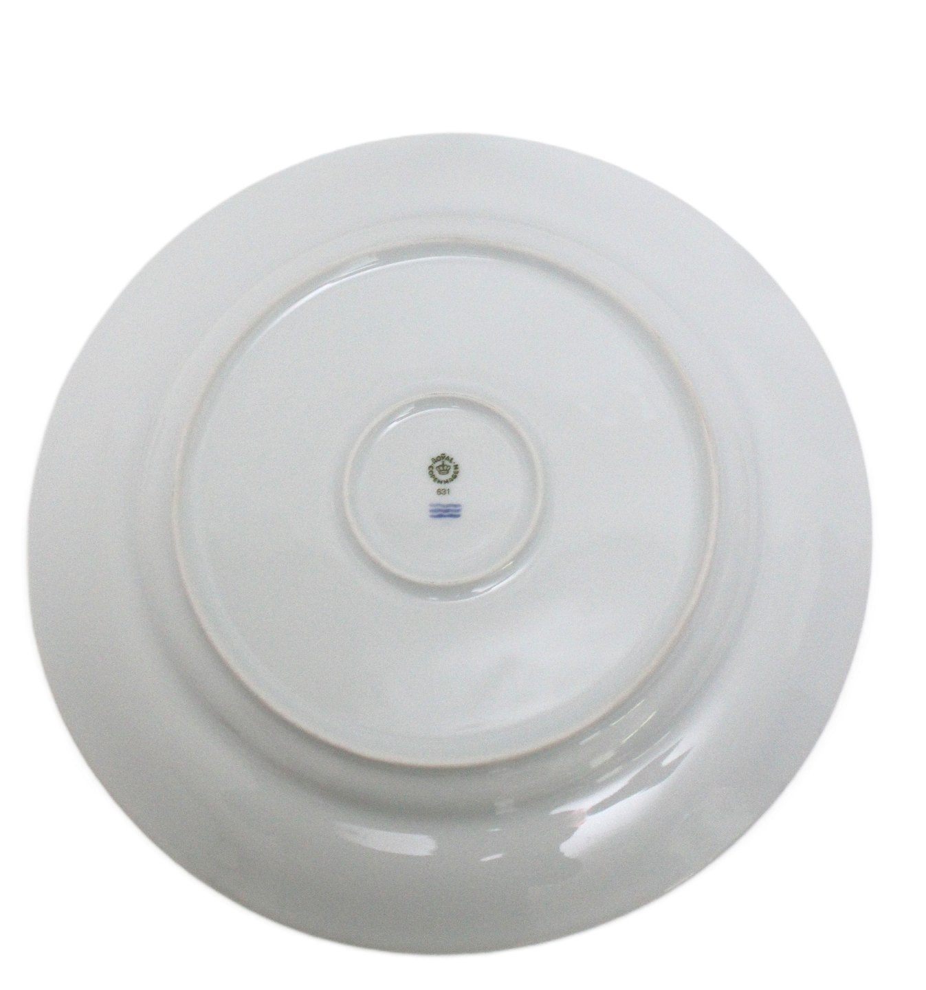 Royal Copenhagen, Blå Magnolia. Dækketallerken eller megastor middagstallerken. Blå marmoreret bort dekoreret med gylden blomsterknop. Designet af Flemming Eskildsen. Nr. 631. Diameter 31,5 cm. I. sortering. Flot stand. Pris: 300 kr. stk. Lager: 16