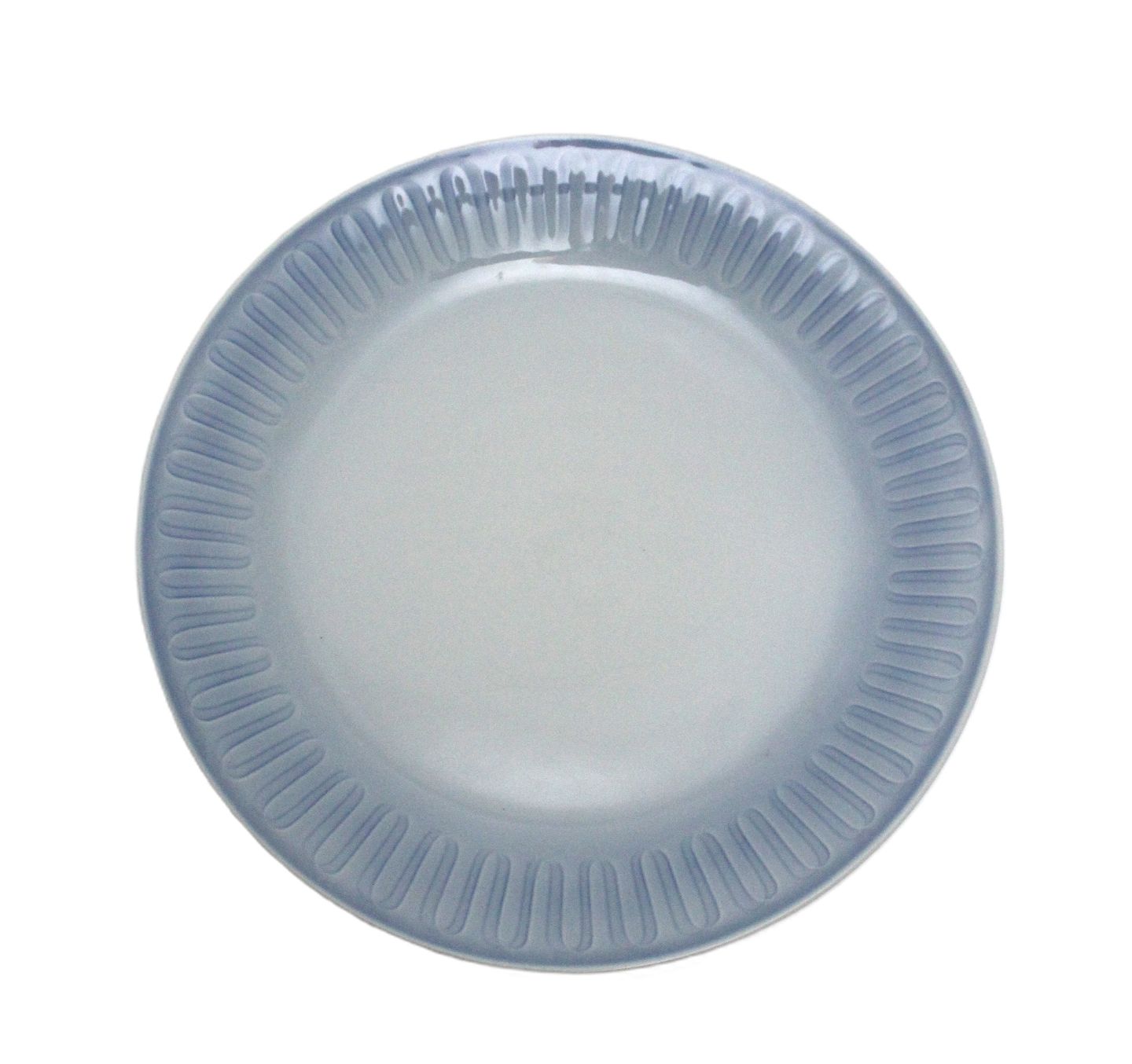 Bing & Grøndahl, Ballerina, lyseblåt porcelæn med stribet reliefmønster på fane. Stor Middagstallerken. Nr. 624. Diameter 26 cm. Fin stand med almindelig brugsspor på overfladen. Pris: 150 kr. stk. Lager: 5
