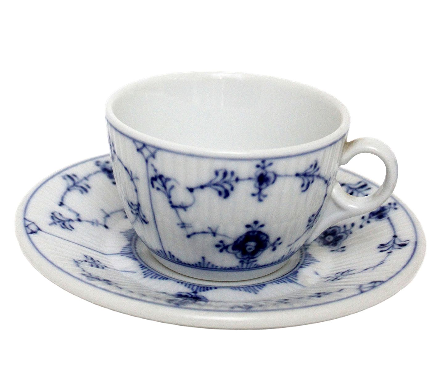 Royal Copenhagen, Musselmalet Riflet. Hotelporcelæn, Jernporcelæn. Robust og kraftigt stel. Stor kaffekop med underkop. Nr. 1/2187. Højde 6 cm. Øverste diameter 9 cm. Underkop diameter 15,5 cm. I. sortering. Pris: 300 kr. stk. Lager: 1