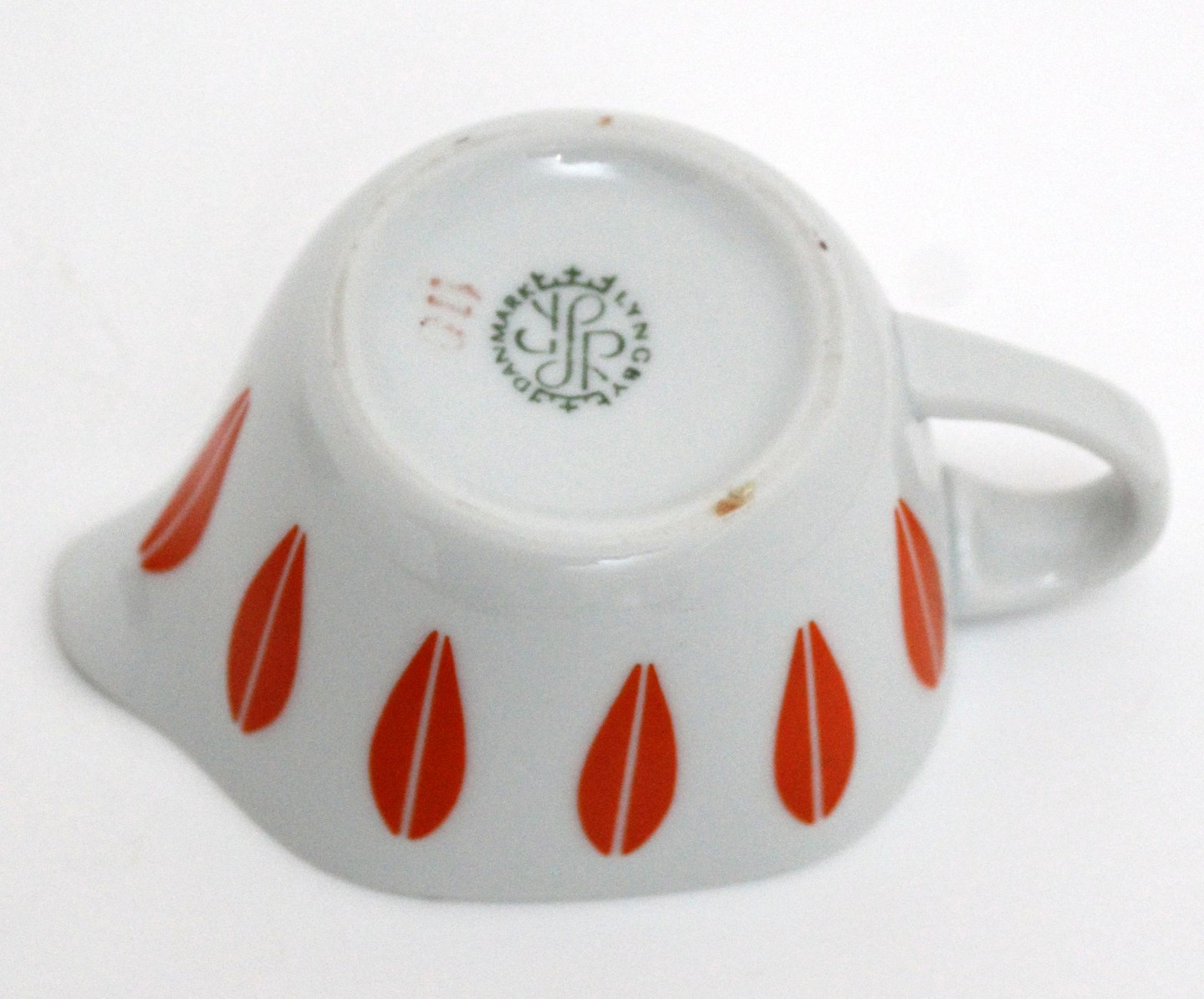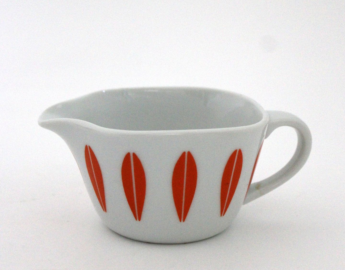 Lyngby, Dan-ild porcelæn, Orange Lotus, Flødekande. Serien Lotus er designet af Grete Prytz Kittelsen for Cathrineholm i 1950'erne. God stand med indvendig brændingsplet. Længde 12 cm. Bredde 7,5 cm. Højde 5 cm. Pris: 200 kr. stk. Lager: 1