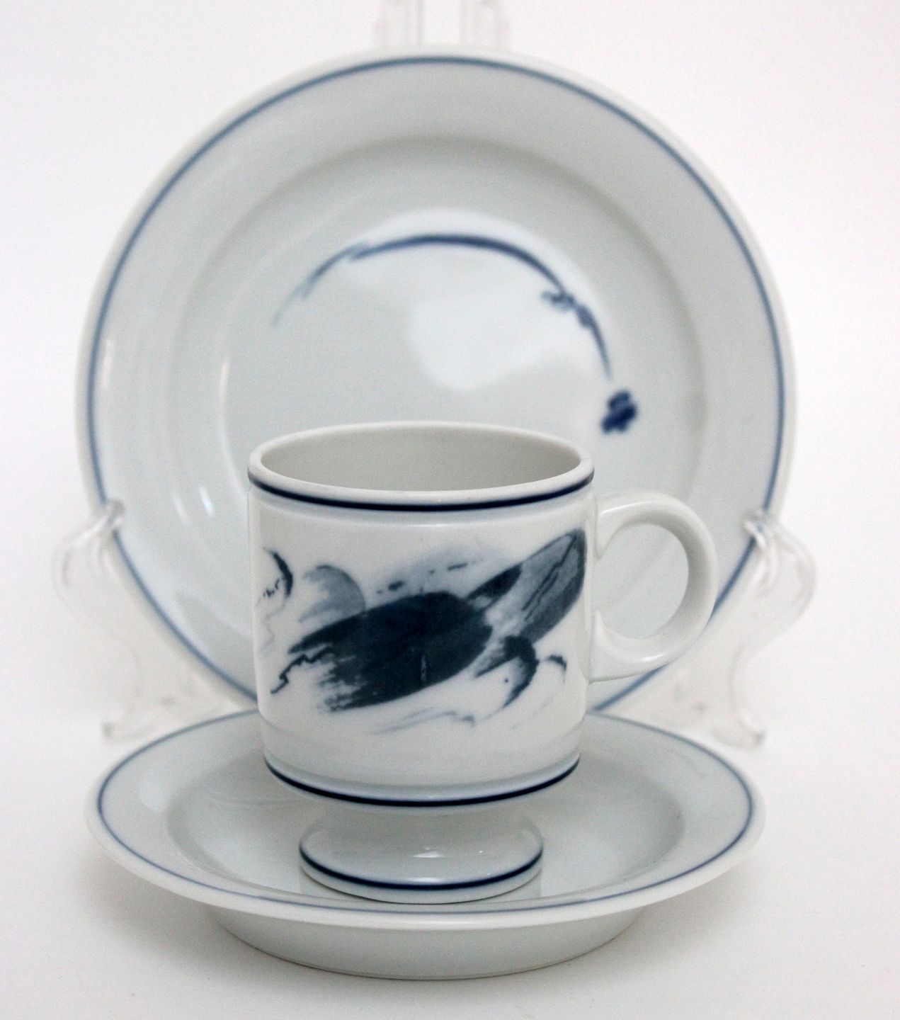 Bing & Grøndahl, Cumulus, Kaffekop og kagetallerken. Designet af Martin Hunt og dekoret af Carl-Harry Stålhane. Produceret fra starten af 1970'erne og 1983. Kop på fod. Nr. 305. Højde 8 cm. Diameter 6,5 cm. Underkop. Diameter 13 cm. Kagetallerken. Nr. 306. Diameter 16 cm.