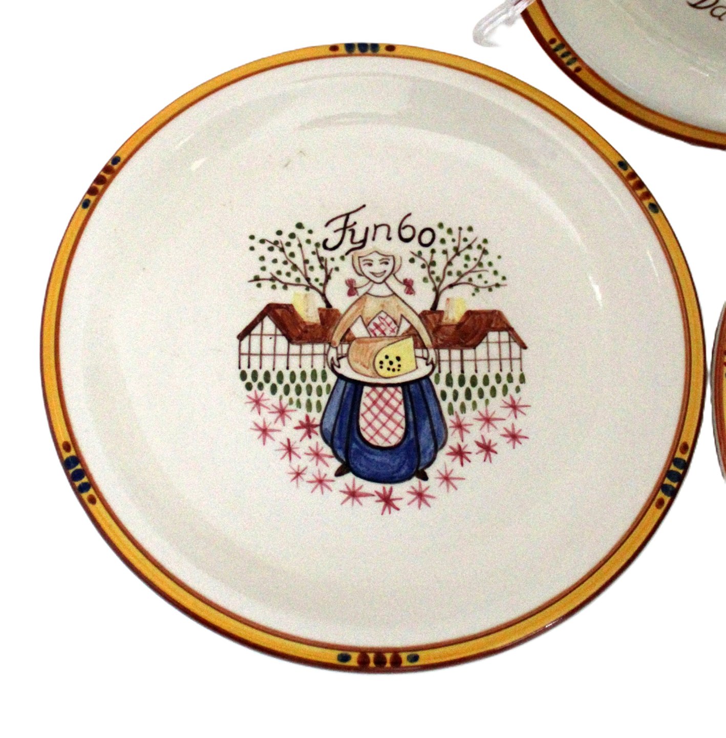 Knabstrup, Ostestellet. Formgivet af Johannes Hansen i 1959 og dekoreret af Paul Høyrup. Motiv og navn for de forskellige danske ostetyper, Fynbo, Molbo, Danbo, Maribo, Esrum og Samsø.