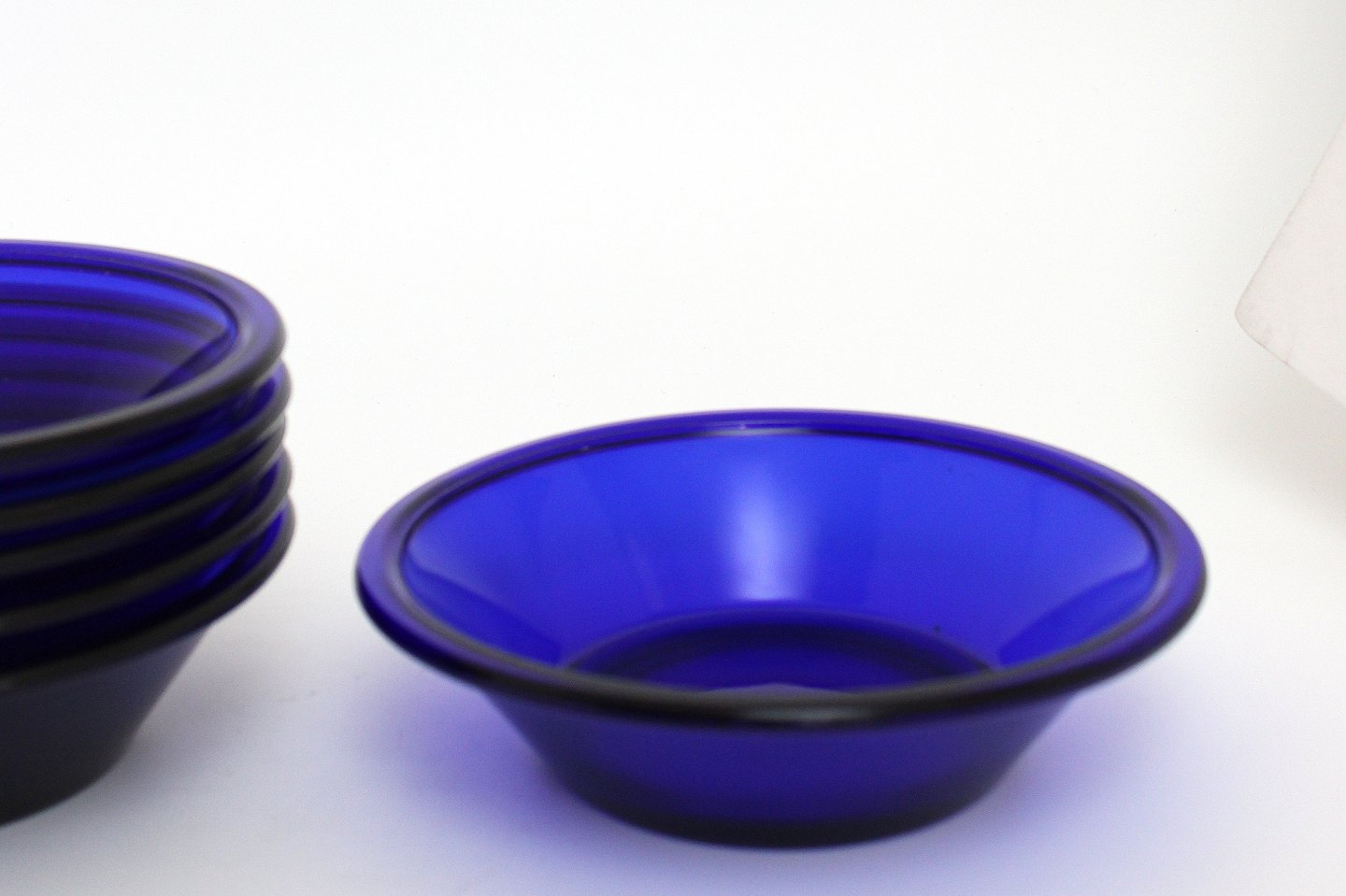 Holmegaard, Else, Tykmælksskål i presset kobolt blå glas. Designet i 1938 og produceret frem til slut 1970'erne i varierende størrelser, men samme form og blev kaldt ymerskål Højde 4 cm. Diameter 15,5 cm. Flot stand. Pris: 100 kr. stk. Lager: 8